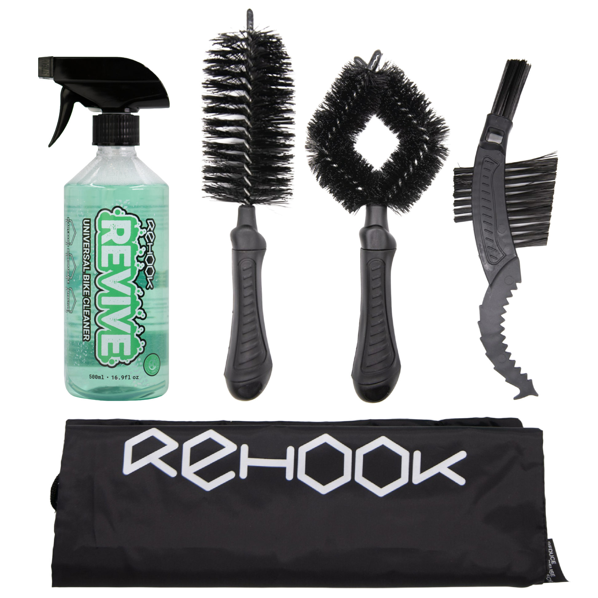 Rehook Revive 5-Piece Bike Cleaning Kit is an essential when it comes to maintaining a clean bicycle. Including Revive Universal Bike Cleaner, All Purpose Brush, Two-Pronged Brush, Claw Brush and a storage bag made from recycled bottles. For clean chains, tyres, sprockets and drivetrains.