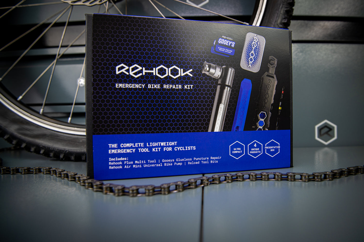 Includes Rehook PLUS Multi-Tool, Rehook AIR Mini Universal Bike Pump, Gooeys Glueless Puncture Repair Patch Kits, Reload Tool Bit Set and Tyre Levers.